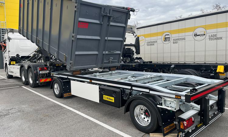 For container and skip logistics: The ÖkoFlex trailer is available in sled, skip or roll-off versions and impresses with its sophisticated frame geometry, high system compatibility and maximum durability.